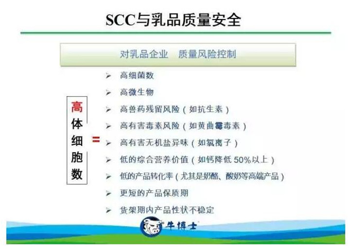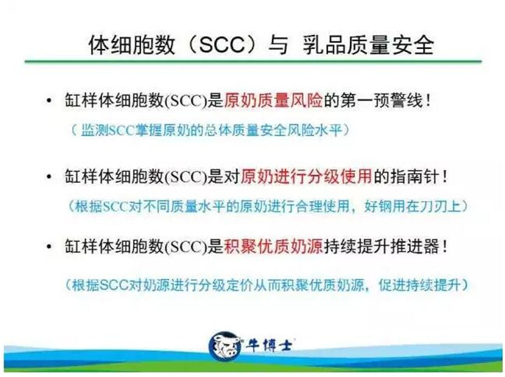 乳品質(zhì)量安全是奶業(yè)振興的“源代碼”,中國奶業(yè)的高質(zhì)量發(fā)展,離不開乳品質(zhì)量的提高,離不開規(guī)范化的飼養(yǎng)、擠奶、運輸,在規(guī)范化的養(yǎng)殖模式下,奶牛更衛(wèi)生,更健康,但這只是好奶源的******步,要衡量生鮮乳整體質(zhì)量的高低,還離不開一個非常重要的指標,那就是牛奶的體細胞數(shù)(SCC)。國際乳業(yè)通識,SCC越低,生乳質(zhì)量越高;SCC越高,對生鮮乳的質(zhì)量影響越大,并對生鮮乳的保質(zhì)期和下游其它乳制品如酸奶、奶酪等的產(chǎn)量、質(zhì)量、風味等產(chǎn)生極大的不利影響。因此被各國專家認為是生鮮乳質(zhì)量標準中***重要的指標之一。體細胞數(shù)在未來是檢測生鮮奶質(zhì)量的不可忽視的重要性指標,它將成為乳企生產(chǎn)好奶源***清晰透明,***扎實有力的證據(jù)!